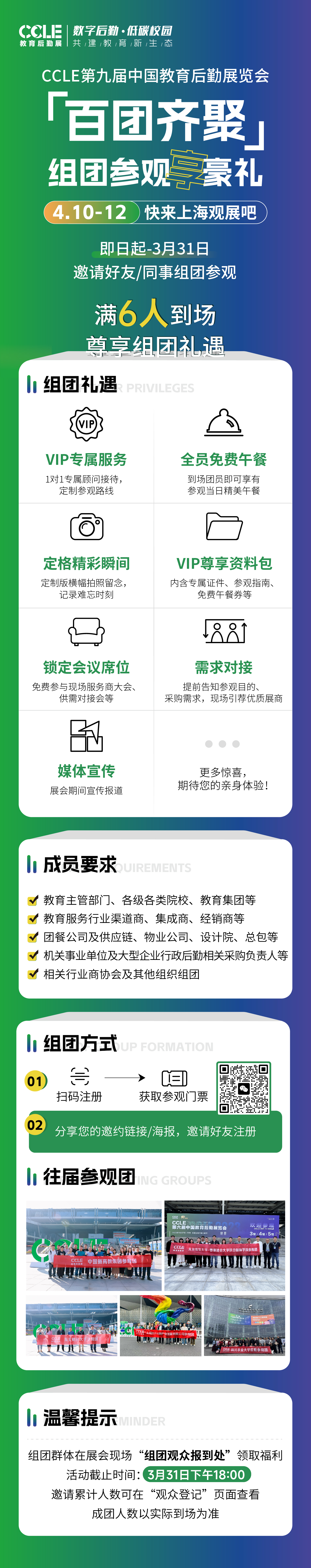 展会现场将全方位展示校园餐饮、能源管理(节能、节水)、安全管理、后勤信息化、物业服务、健康空间、环保家具、学生公寓及教师公寓服务、校园商贸、连锁品牌、校园文创、校园建设与修缮、中小学后勤、后勤育人等领域多个细分业态,汇聚数千种新技术、新设备、新服务,助力学校大后勤服务智能、高效升级。