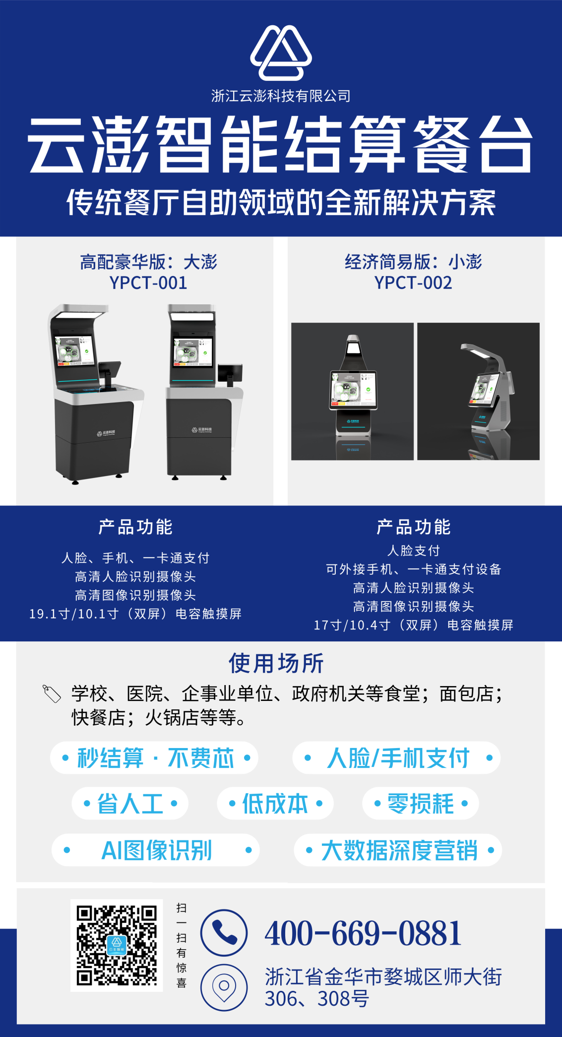 云澎智能结算餐台分为高配豪华版“大澎”、经济简易版“小澎”两款,如下: