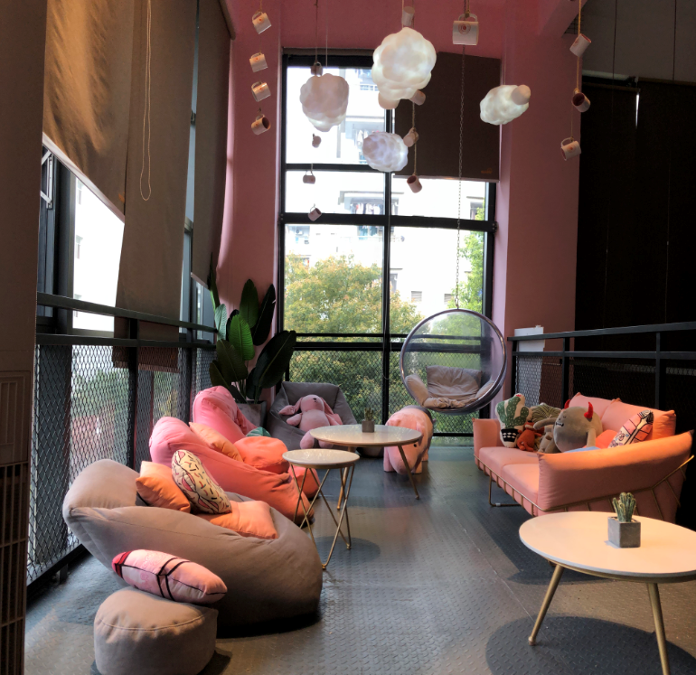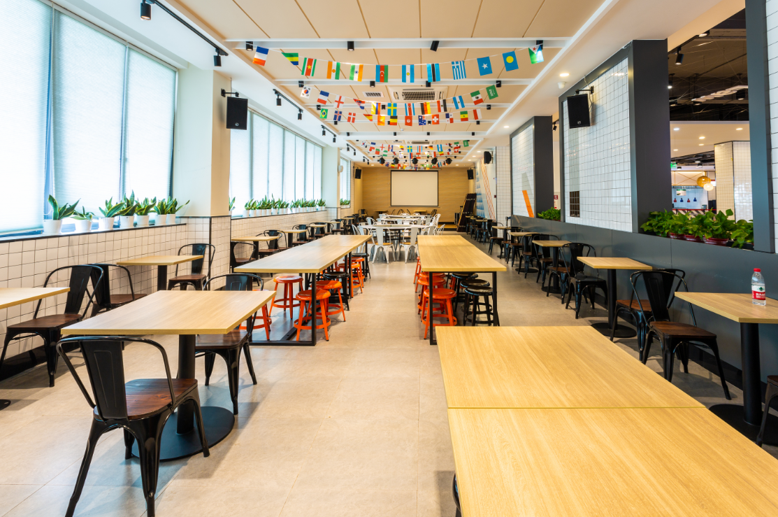 上海外国语大学:用绿色装点墙面,吊灯,餐桌,红椅,小清新自然风的装饰风格受到外国语大学生的喜爱。