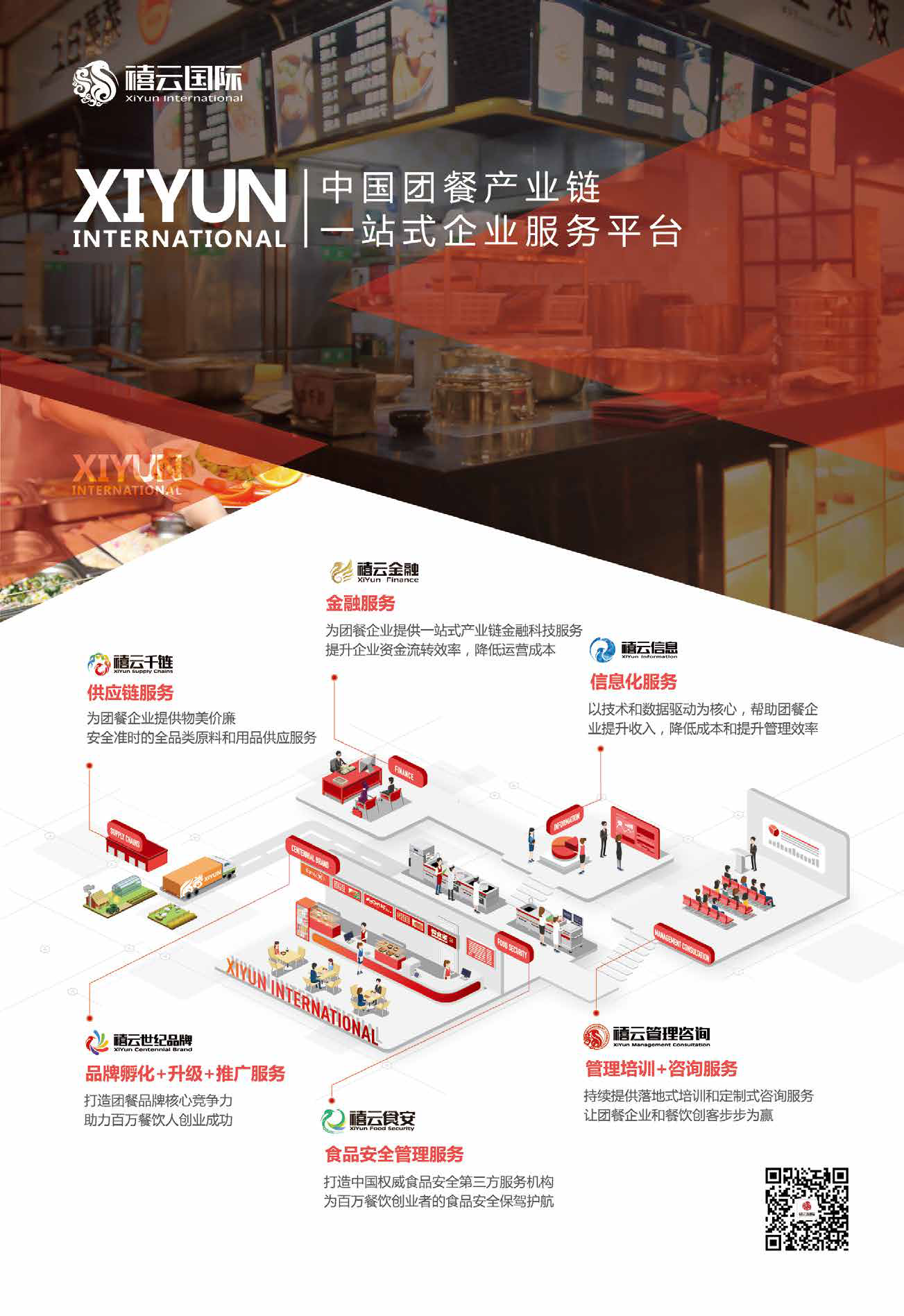 禧云国际与中国烹饪协会、中国饭店协会、中国教育后勤协会等行业专业机构和行业顶尖合作伙伴建立了深度的战略合作关系。截至目前,公司旗下各板块业务已累计服务3,600 余家餐饮中心、45,000 余家档口门店、覆盖团餐营业收入180 亿元、触达团餐消费用户15 亿人次,所服务团餐企业客户遍布全国31个省市,涵盖:大学、中学、医院、厂矿企业、金融机构、政府机关、IT 科技系统、铁路机场、养老餐等诸多市场领域。公司于2017 年获得了来自蚂蚁金服、鼎晖投资和阿里巴巴旗下口碑网A 轮2 亿美金的战略投资。未来,禧云国际将通过整合团餐产业链及互联网平台各环节资源,打通行业上下游服务信息链条,构建团餐消费场景用户入口,专注打造全产业协同共享的良好生态,为团餐企业的转型与发展持续赋能,实现与行业伙伴、团餐企业、消费者的多方共赢,共同推动产业的快速升级,搭建万亿级团餐产业链企业服务平台,帮助更多的餐饮创业者实现梦想,让天下没有难做的团餐生意。