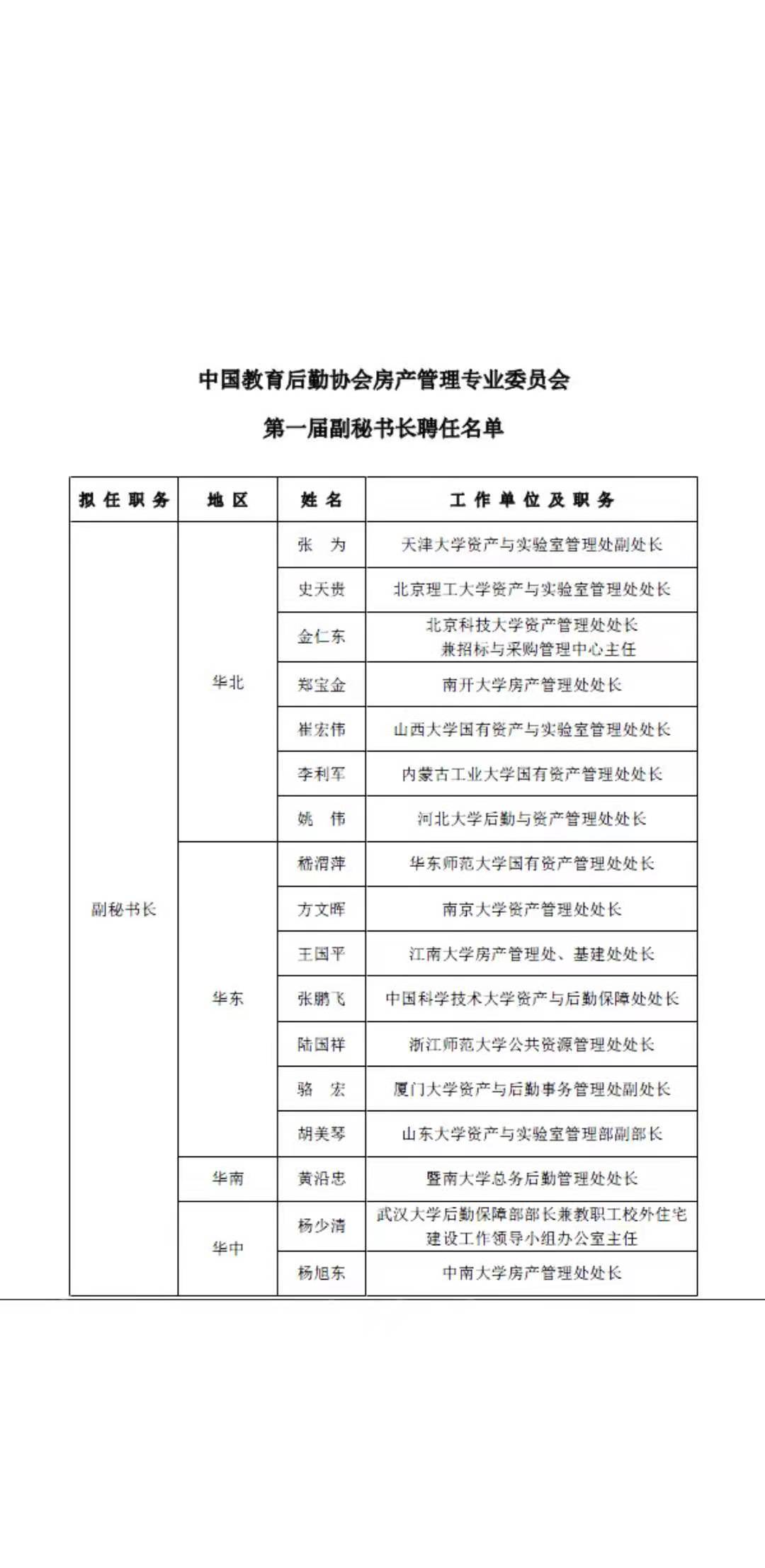 中国教育后勤协会房产管理专业委员会第一届全体委员大会的全体委员代表听取了“关于中国教育后勤协会房产管理专业委员会筹备工作报告”、审议通过了《中国教育后勤协会房产管理专业委员会组织规则(草案)》;选举产生了第一届房专会常委会常委77名。大会一致选举通过中国教育后勤协会常务副会长兼秘书长、中国人民大学原党委常务副书记、副校长牛维麟任主任;选举通过天津大学校长助理刘宁、北京大学房产管理部部长殷雪松、清华大学房产管理处处长李功强等十二位同志任副主任;选举通过刘宁任秘书长。房专会一届一次常委会根据秘书长提名审议通过了27位副秘书长的聘任;讨论通过了房专会发展战略和工作规划。