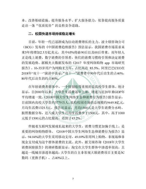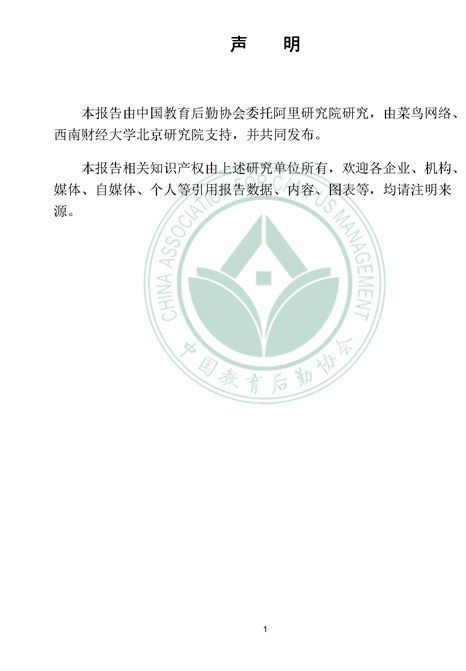 2019年12月21日, 校园快递行业发展报告(2019)发布。报告由中国教育后勤协会委托阿里研究院研究,由菜鸟网络、西南财经大学北京研究院支持。