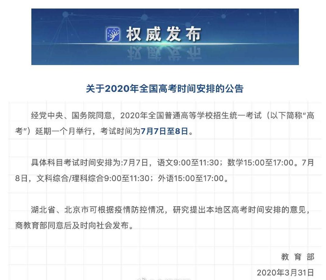 2020年3月31日,党中央、国务院正式发出通知,2020年全国普通高等学校招生统一考试将延期至2020年7月7日至8日,2020年高三考生将增加一个月复习备考时间。