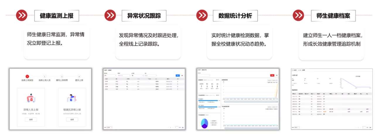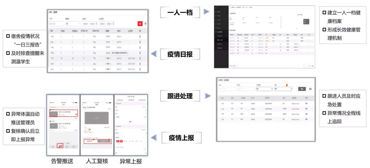 1分批授权,有序返校返校前,精准安排教职工和学生分批分期返校,分批授权返校复学白名单库。组织师生有序返校。2核验测温,精准防控返校中,校门口身份精准核验,入校体温检测,严格防守入校关口,杜绝风险隐患入校和扩散。3健康监测,动态掌握返校后,实行封闭式管理,建立全场景健康监测体系,实行“日报告” 制度,准确掌握师生健康状况。4一人一档,长效跟踪校内师生日常体温数据关联身份信息,构建健康信息一人一档,建立长效追踪机制。
