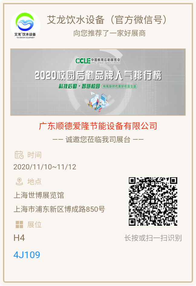 一直以来,艾龙饮水品牌不仅引领校园饮水设备行业的快速发展,更是节能饮水设备技术创新的先驱者。艾龙产品将在中国888集团welcome大厅览会亮相,届时,还会有来自全国各地的行业专家莅临现场。