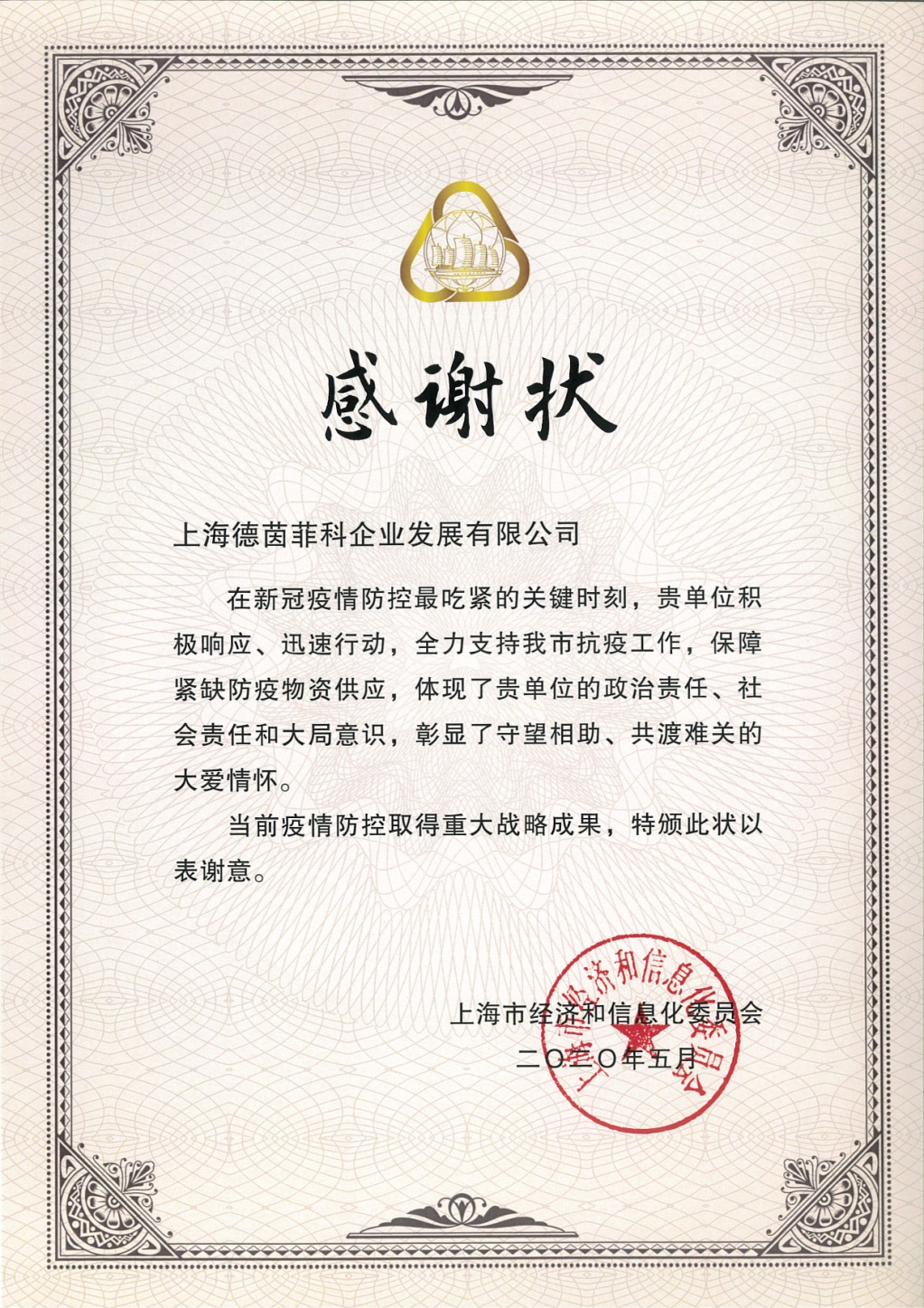 2020年元月,德茵菲科是湖州地区最早投入防疫物资生产的企业之一,成为湖州市政府及上海市政府防疫物资生产征用单位。同时,在最短时间里,德茵菲科先后又向武汉、浙江、上海、北京、山东、贵州、陕西、江西、福建、河北等红十字会、慈善总会、学校、养老机构等捐赠了大量消毒用品,累计捐赠价值630多万元的消毒物资,在积极履行社会责任中,践行企业价值。