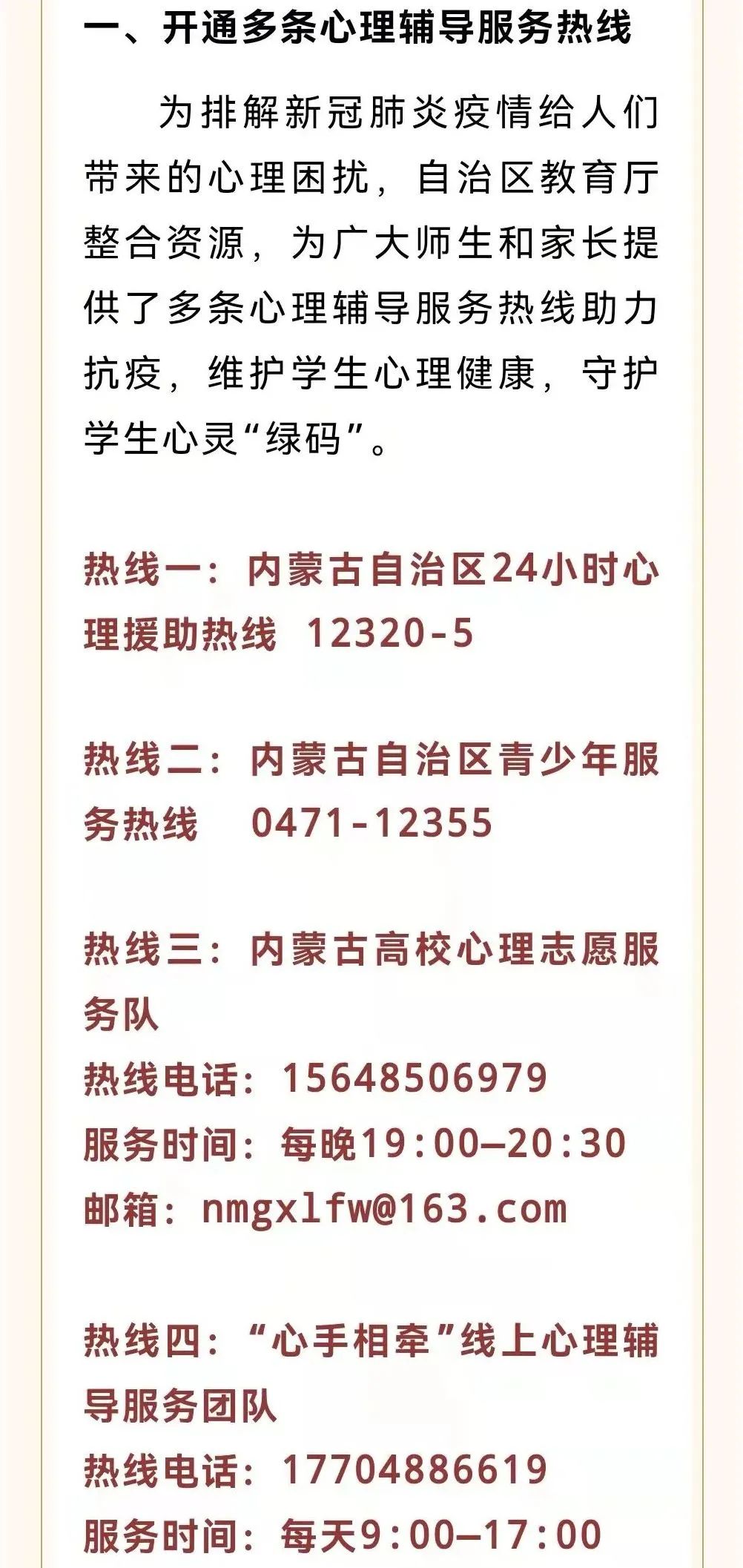 针对近期突发的新型冠状病毒肺炎疫情,内蒙古自治区教育厅广泛动员各方力量,组织全区15个大学生心理健康教育示范中心联合为全区大中小学师生、家长送出情绪调节、学业衔接、常态化疫情下亲子关系的心理微课、短视频、图文推送、身心健康操等线上资源,开通多条心理辅导服务热线,筑起抗疫“心”防线。