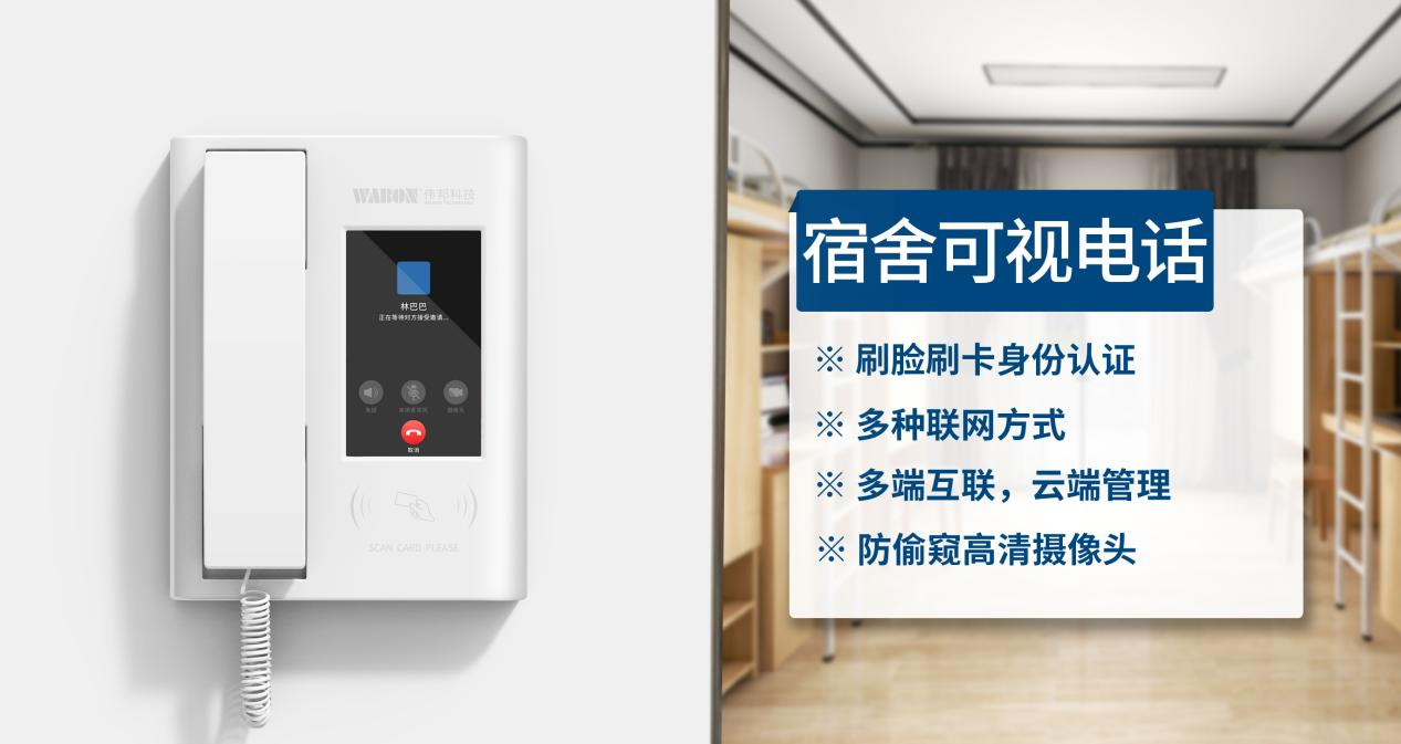 伟邦科技自主研发智能可视电话,旨在进一步提升家校高沟通效率,通过部署在教学公共区或宿舍区,学生可通过人脸识别或刷卡认证快速与父母发起视频通话,语音通话,在线留言等服务,进一步提升家校沟通的效率和质量,助力学校推动现有公用电话设施的硬件升级,提高办学品质,推进家校共育。