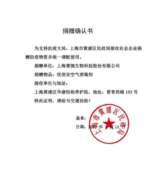 在当前疫情形势严峻的情况下,上海莱慎生物科技股份有限公司克服重重困难,迅速筹措各类防疫物资,保障消杀防疫工作,并先后向全国多个地区捐赠防疫物资,展现了企业强大的社会责任感。