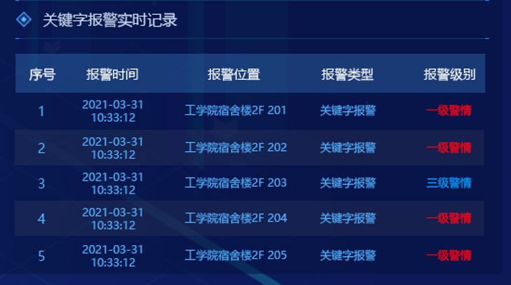 针对欺凌事件数据特征,北望信息通过安装关键词预警装置在宿舍、卫生间、楼梯角等隐蔽位置,通过智能AI处理对实时语音流的分析,实现"救命"、"打死你"、"欠揍"等关键词的甄别报警,报警信息会实时发布在平台软件,伴随语音示警,安保或老师可联动附近摄像头画面判断是否有危险情况发生并通过广播话筒发出警告,及时发现并制止暴力行为。
