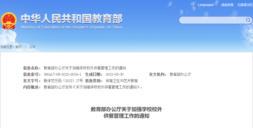 近期,教育部办公厅印发了《关于加强学校校外供餐管理工作的通知》(以下简称《通知》),对加强学校校外供餐管理工作提出明确要求。