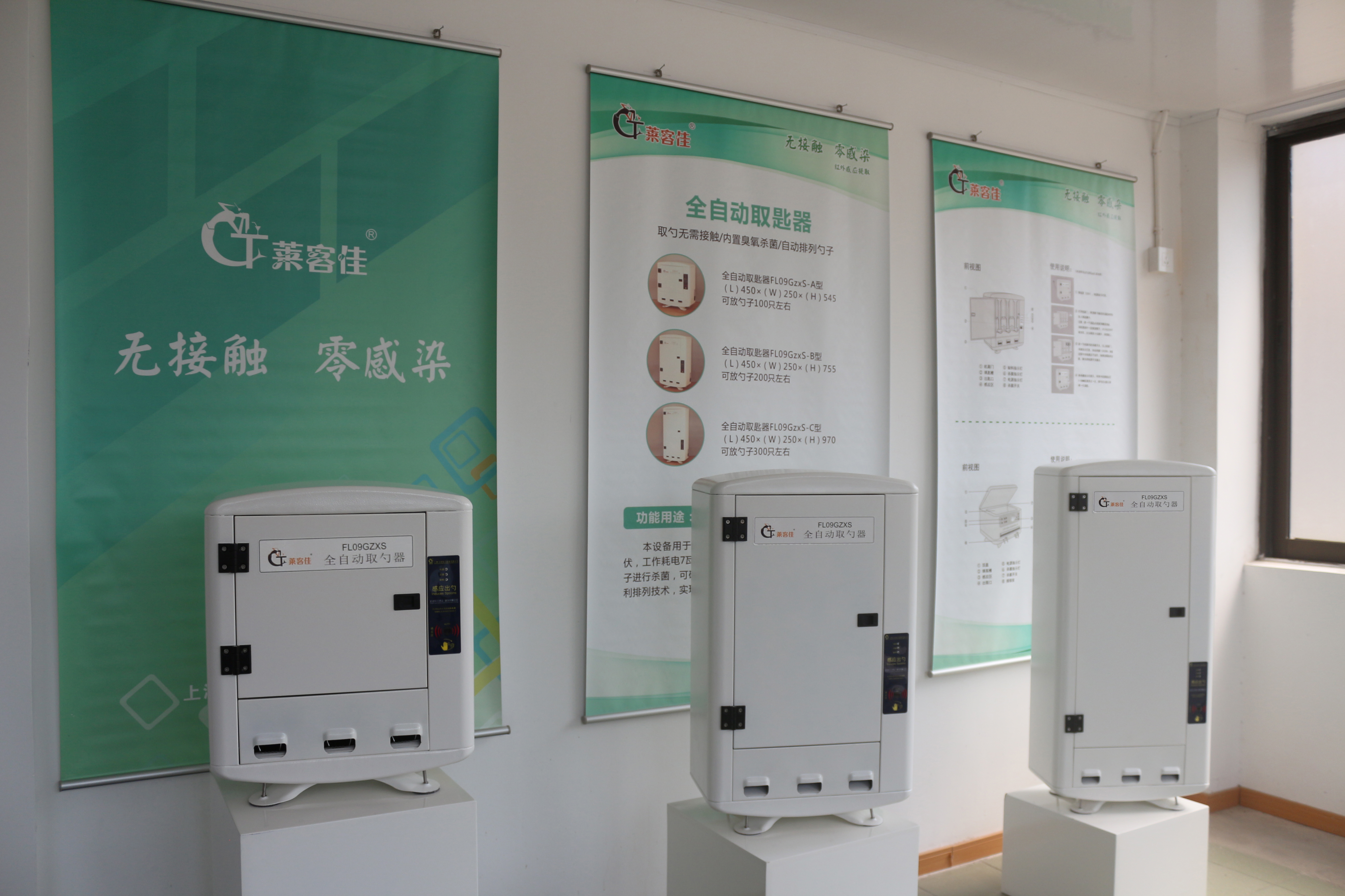 两款产品因使用场景和就餐人数的需要,设计了各3款容量机型:自动取筷器F08G-I(可放100双筷子)、F08G-II(可放200双筷子)、F08G-III(可放300双筷子);自动取匙器FL09GzxS-A(可放100只勺子)、FL09GzxS-B(可放200只勺子)、FL09GzxS-C(可放300只勺子)。