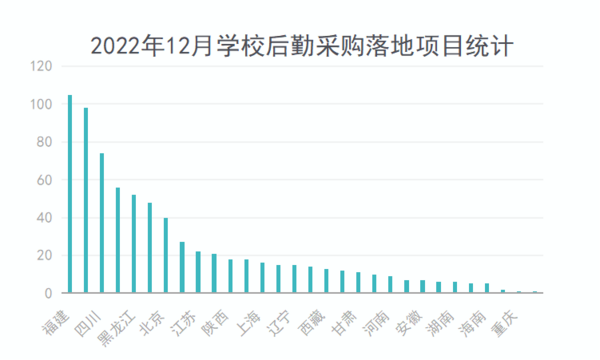 2022年12月30个省市自治区有学校后勤采购项目落地,福建、广东和四川三地项目落地数量位居前三。