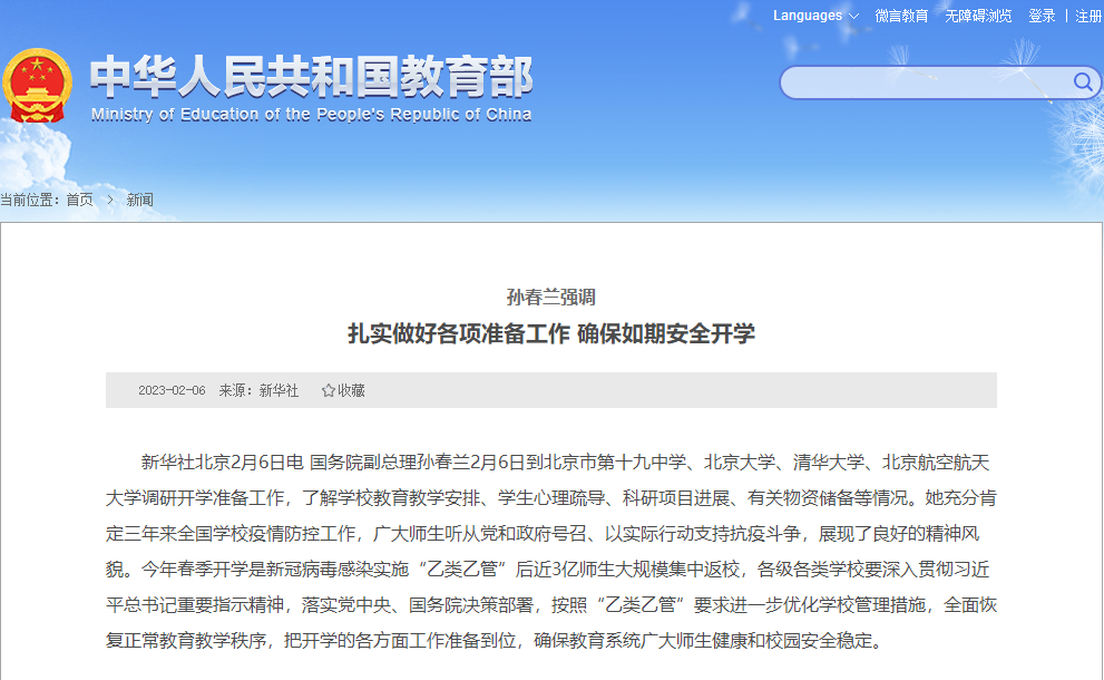 国务院:副总理孙春兰在调研开学准备工作中指出,开学前要全面摸排师生感染情况,组织有序安全返校。开学后要发挥学校卫生室、校医院、健康驿站等作用,动态储备药品物资,加强师生健康监测和健康管理,中小学校、幼儿园要落实晨午检、传染病报告、缺勤缺课追踪等制度,指导师生加强营养饮食、规律作息、适度运动、日常防护,树牢健康第一理念,落实好自身健康责任。