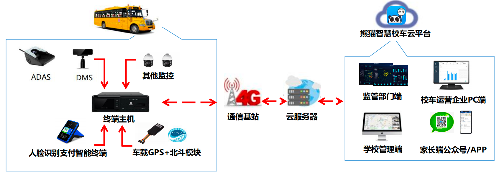 【熊猫出行·智慧校车】采用GPS定位技术、4G通信,集学生刷脸测温等为一体的系统+运营的联合运营服务平台。熊猫智慧校车管理系统是专为校车安全管理研发,采用最前沿的北斗/GPS双模定位技术、4G/无线通信及视频处理技术,集学生刷脸测温、车内外视频监控、校车司机主动安全监测,便捷支付等功能为一体的统一信息管理平台,针对行业管理痛点,实现对校车的全程跟踪、监控、预警和提醒,为家长、学校、校车运营企业、监管部门提供一体化、多通道、全方位的数字校车服务平台。