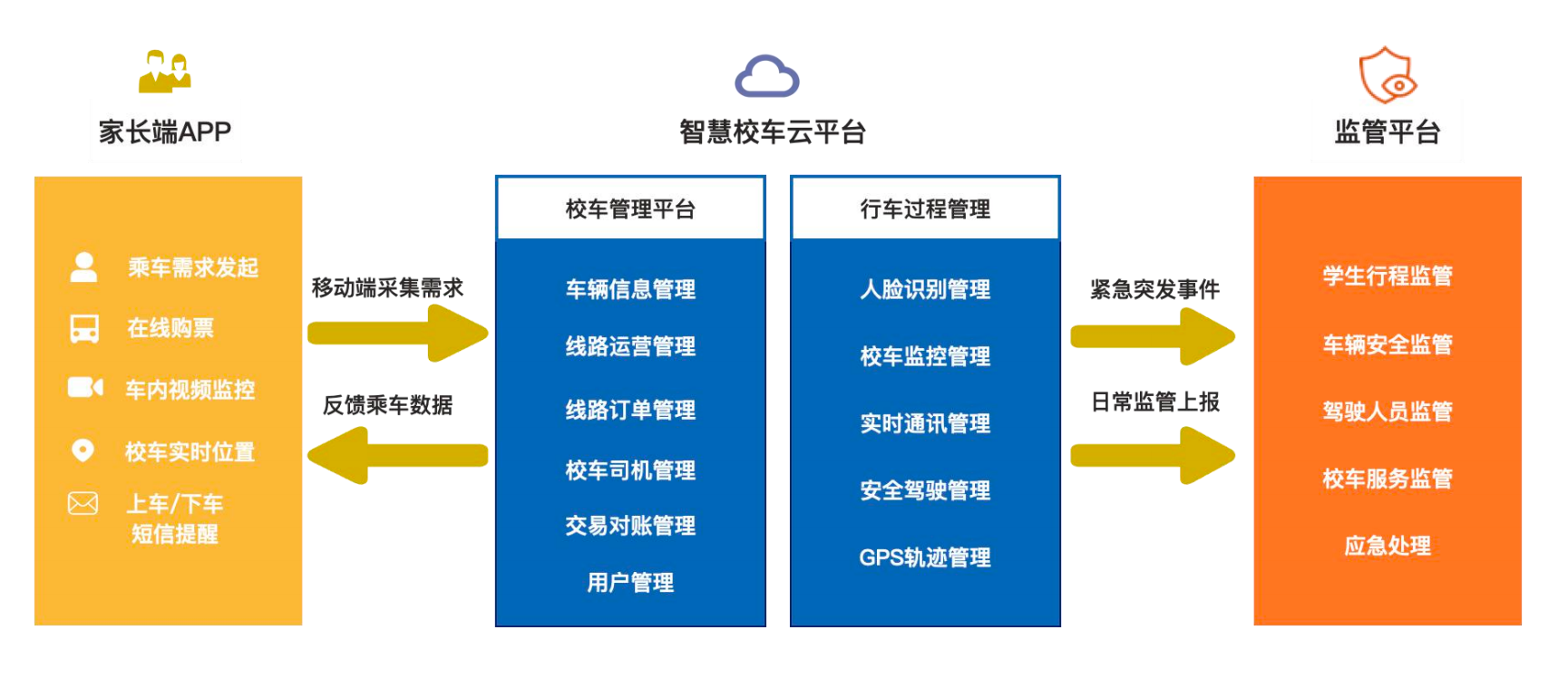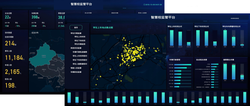 智慧校车监管平台:通过集成人脸识别、即时通讯、车载监控、车载GPS定位等技术,实现对学生行程安全的全方位管理,实现对车辆轨迹、驾驶人员的全程监管,实现对突发情况的时响应。