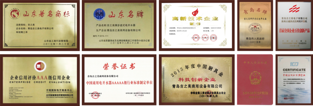 青岛吉之美商用设备有限公司创建于2004年,拥有雄厚的技术积淀,是八项国标、行标及团标的起草与修订单位,荣获山东省著名商标、山东名牌、青岛名牌、中央国家机关开水器节能改造首选品牌,高新技术企业、隐形冠军企业、中国商用电开水器5A级行业标准制定单位、全国产品和服务质量诚信示范企业、全国企业标准领跑者等荣誉。