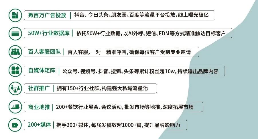 数字团餐服务、品牌档口,食材供应、米面粮油、净菜蔬果、预制菜、营养餐、咖啡茶饮,环保餐具、智慧结算台、炒菜机器人、洗碗机、果蔬清洗设备等厨房设备,食安监管,中央厨房解决方案、食堂及厨房环境建设方案、智慧食堂整体解决方案等。