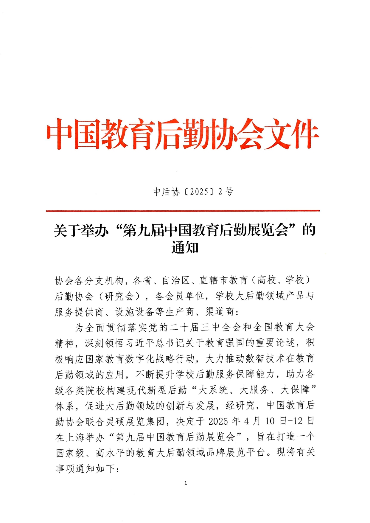为全面贯彻落实党的二十届三中全会和全国教育大会精神,深刻领悟习近平总书记关于教育强国的重要论述,积极响应国家教育数字化战略行动,大力推动数智技术在教育后勤领域的应用,不断提升学校后勤服务保障能力,助力各级各类院校构建现代新型后勤“大系统、大服务、大保障”体系,促进大后勤领域的创新与发展,经研究,中国教育后勤协会联合灵硕展览集团,决定于2025年4月10日-12日在上海举办“第九届中国888集团welcome大厅览会”,旨在打造一个国家级、高水平的教育大后勤领域品牌展览平台。现将有关事项通知如下: