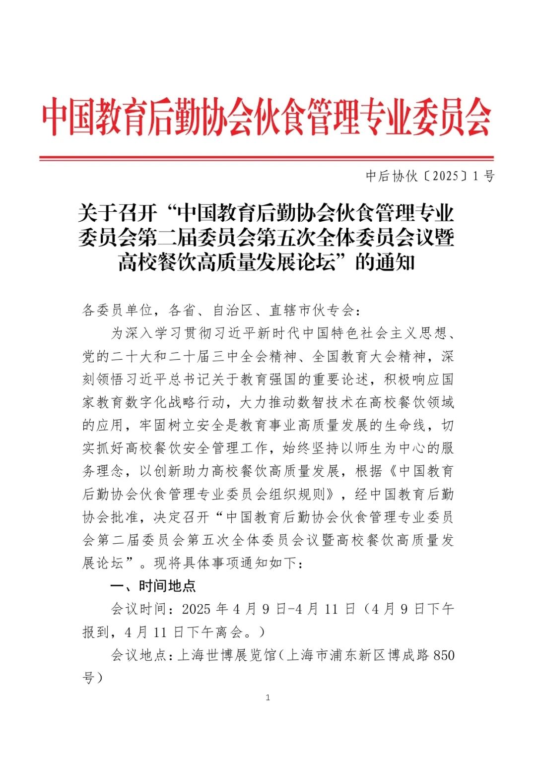 为深入学习贯彻习近平新时代中国特色社会主义思想、党的二十大和二十届三中全会精神、全国教育大会精神,深刻领悟习近平总书记关于教育强国的重要论述,积极响应国家教育数字化战略行动,大力推动数智技术在高校餐饮领域的应用,牢固树立安全是教育事业高质量发展的生命线,切实抓好高校餐饮安全管理工作,始终坚持以师生为中心的服务理念,以创新助力高校餐饮高质量发展,根据《中国教育后勤协会伙食管理专业委员会组织规则》,经中国教育后勤协会批准,决定召开“中国教育后勤协会伙食管理专业委员会第二届委员会第五次全体委员会议暨高校餐饮高质量发展论坛”。现将具体事项通知如下:
