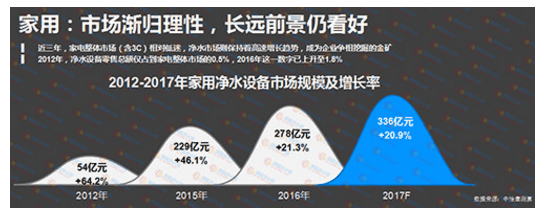 数据显示,2012年整个家用净水的规模只有54亿,到今年年底预计会达到336亿,市场容量增加了5倍,这是第一个需要关注的点。从数据可以看到,从2016年开始,整个市场增长速度放缓,最近两年维持在20%左右的增长速度。在2015年之前,市场增长速度在50%左右,甚至更高,这是要关注的第二点。2012年,净水产业只占全体家电销售额的0.5%,也就是说贡献了0.5%的销售规模,2016年这个数字已经上升到1.8%。