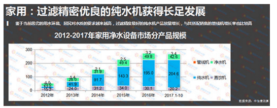 在整个行业的内部来讲,采用RO技术的产品发展前景或者目前现状是相对比较好的。2012年和2017年对比,首先看绝对规模,2012年纯水机有17个亿,而今年前10个月已经超过200亿,这个体量占到市场的75%左右,增长速度确实惊人。从上面的数据看见,整体净水增长是在20%左右,而纯水机的增长会更高一点,会在28%—30%。