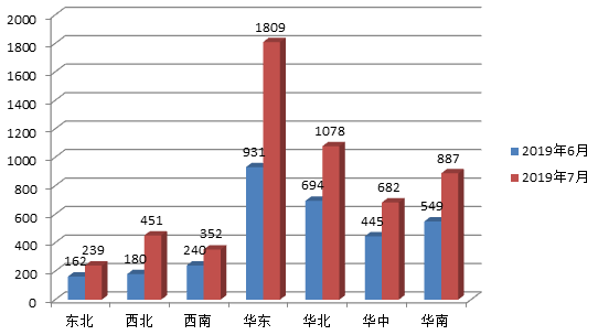 由地区数据中可知:7月份各地区的招标采购信息量均呈现大幅增长的趋势,其中,华东、华北、华南地区的招标采购信息量较大。具体到省份中,福建、广东、河北、山东、北京、安徽等省份的招标信息量较多。