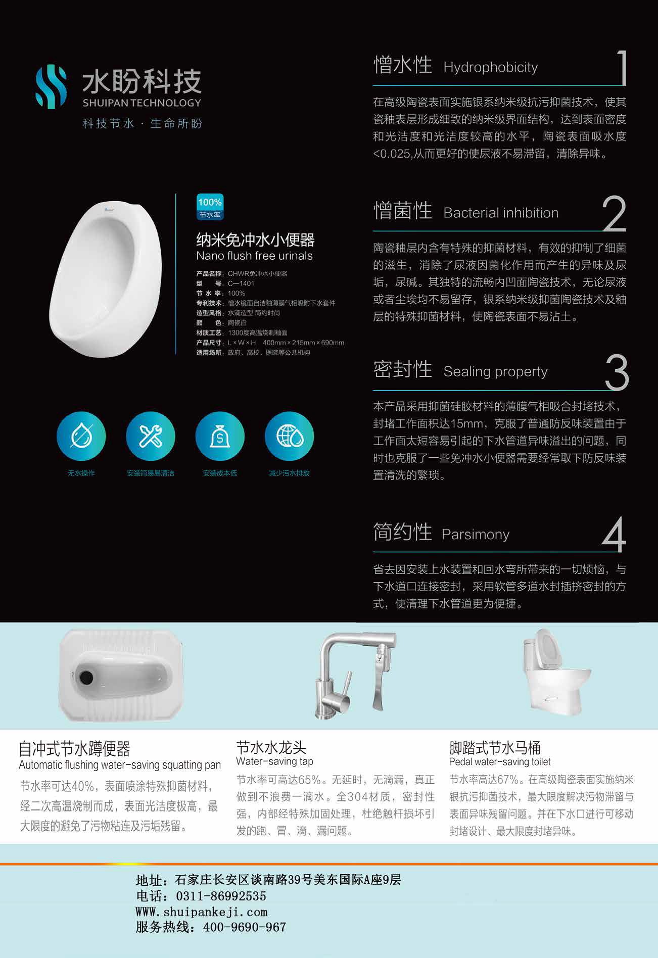 公司主要在售产品为我公司自主研发的“免冲水小便器”“自闭式接水龙头”“超级节水马桶”“智能蹲便器”我们一直致力于公共机构卫生间的节水工作,产品均是基于能简勿繁、操作简单、维护简便、重物理原理而轻电子设备等原则而研发的。作为中国卫生间节水管理领域的重要推动者,水盼科技一直致力于卫生间节水方面的合同节水管理模式的探索与实践。我们坚持“想客户之所想,用科技的力量为客户单位节约下每一滴可节约的水”的服务理念,运用多种合同节水管理模式为每一位有节水需求的客户带去量身打造的节水方案。水盼科技愿与社会各界携手并进,共同努力,一起守护我们地球上的每一滴水。